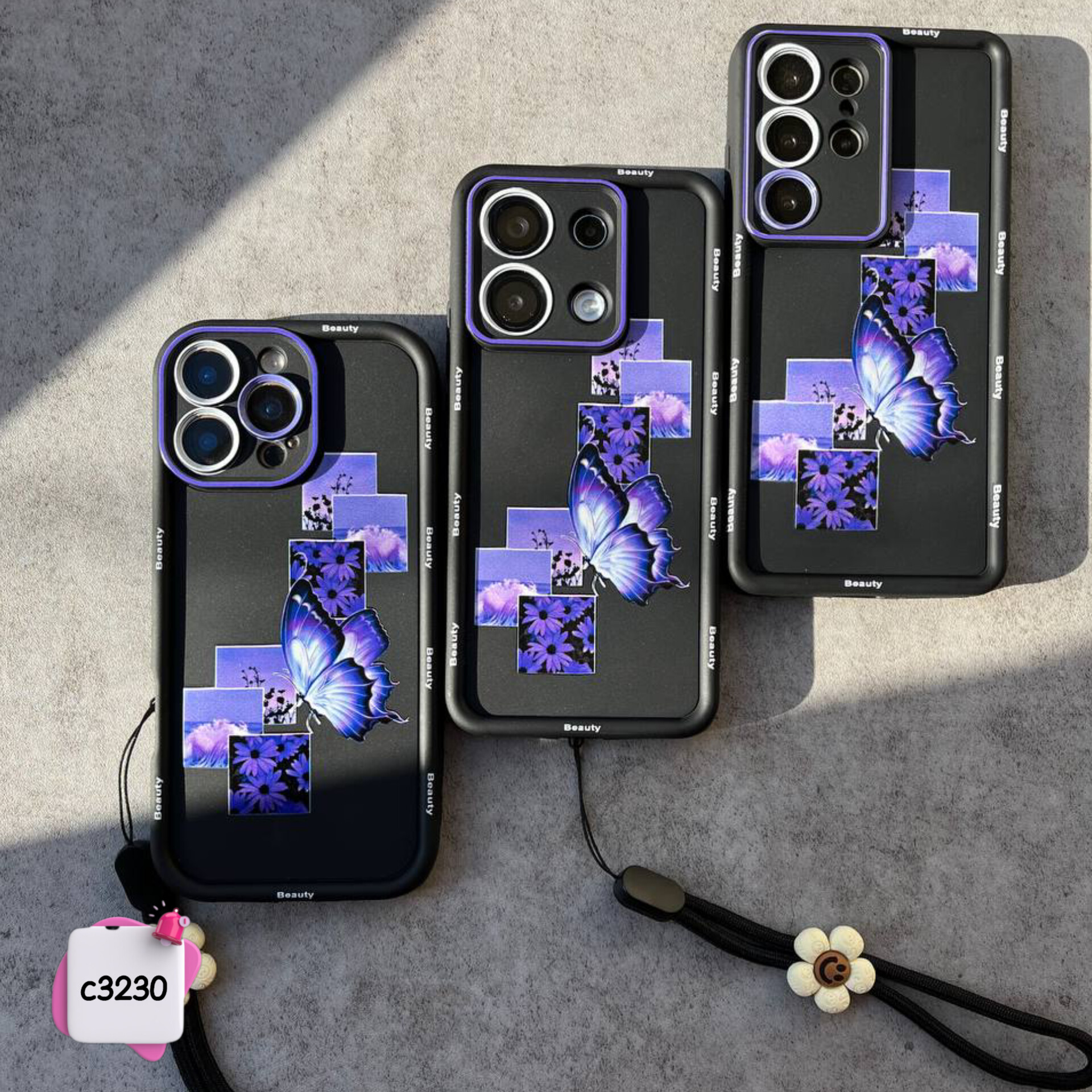 قاب گوشی سولید پروانه بنفش + آویز c3230 / ایفون سامسونگ شیائومی